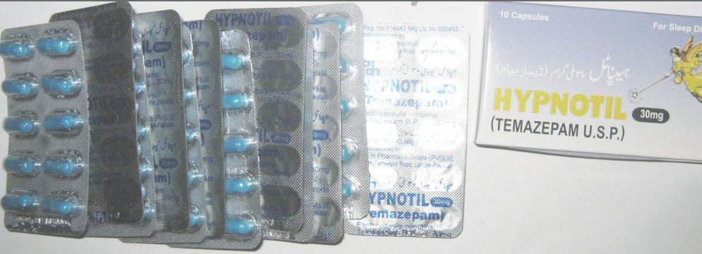 Hypnotil (Temazepam) 30mg is a white, crystalline substance, very slightly soluble in water and sparingly soluble in alcohol USP. Restorilâ„¢ (temazepam) capsules, 7.5 mg, 15 mg, 22.5 mg, and 30 mg, are for oral administration. 7.5 mg, 15 mg, 22.5 mg, and 30 mg Capsules Active Ingredient: temazepam USP 7.5 mg Capsules Inactive Ingredients: FD&C Blue #1, FD&C Red #3, gelatin, lactose, magnesium stearate, red iron oxide, titanium dioxide. May also include: n-butyl alcohol, iron oxide red, shellac, shellac glaze, SD-35A alcohol. 15 mg Capsules Inactive Ingredients: FD&C Blue #1, FD&C Red #3, gelatin, lactose, magnesium stearate, red iron oxide, titanium dioxide. May also include: n-butyl alcohol, FD&C Blue #1 / Brilliant Blue FCF Aluminum Lake, iron oxide red, isopropyl alcohol, propylene glycol, shellac, shellac glaze, SD-35A alcohol, SD-45 alcohol. 22.5 mg Capsules Inactive Ingredients: FD&C Blue #1, FD&C Red #3, gelatin, lactose, magnesium stearate, red iron oxide, titanium dioxide. May also include: n-butyl alcohol, FD&C Blue #1 / Brilliant Blue FCF Aluminum Lake, iron oxide red, isopropyl alcohol, propylene glycol, shellac, shellac glaze, SD-35A alcohol, SD-45 alcohol. 30 mg Capsules Inactive Ingredients: FD&C Blue #1, FD&C Red #3, gelatin, lactose, magnesium stearate, red iron oxide, titanium dioxide. May also include: n-butyl alcohol, FD&C Blue #1 / Brilliant Blue FCF Aluminum Lake, iron oxide red, isopropyl alcohol, propylene glycol, shellac, shellac glaze, SD-35A alcohol, SD-45 alcohol.